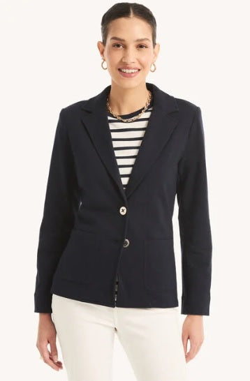 Confeccionado en algodón con un toque elástico, este blazer de punto presenta un cierre de doble botón y solapa de muesca para una apariencia elegante y clásica.