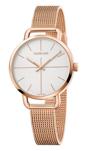 Caja de acero inoxidable con PVD en oro rosa y brazalete de malla de acero inoxidable con PVD en oro rosa. Bisel fijo de PVD en oro rosa. Esfera blanca con manecillas luminosas en tono oro rosa y marcadores de hora índice. Tipo de esfera: analógica. Manos luminiscentes. Movimiento de cuarzo. Cristal mineral resistente a los arañazos. Tirar/empujar la corona. Parte trasera sólida. Forma de caja redonda. Tamaño de la caja: 36 mm. Grosor de la caja: 8 mm. Ancho de banda: 14 mm. Pliegue sobre deslizamiento a través del cierre. Resistente al agua a 30 metros / 100 pies. Funciones: hora, minuto. Incluso Serie. Estilo de reloj informal. Etiqueta del reloj: Swiss Made. Reloj Calvin Klein Even de cuarzo con esfera blanca para mujer K7B23626.