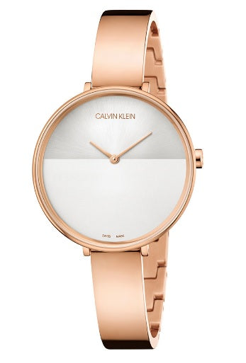 Caja de acero inoxidable con PVD en oro rosa con brazalete de acero inoxidable con PVD en oro rosa. Bisel fijo de acero inoxidable con PVD de oro rosa. Esfera plateada y blanca con manecillas en tono oro rosa. Sin marcadores. Tipo de esfera: analógica. Movimiento de cuarzo. Cristal mineral resistente a los arañazos. Tirar/empujar la corona. Parte trasera sólida. Forma de caja redonda, tamaño de caja: 38 mm, grosor de caja: 8 mm. Ancho de banda: 12 mm. Broche de joyería. Resistente al agua a 30 metros / 100 pies. Funciones: hora, minuto. Serie Subida. Estilo de reloj informal. Etiqueta del reloj: Swiss Made. Calvin Klein Rise Cuarzo Plata y Blanco Ladies Watch K7A23646.