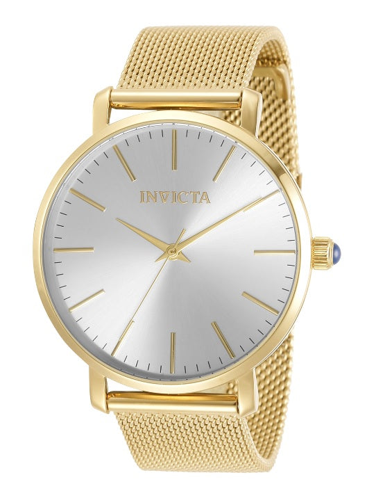 Este impresionante reloj Invicta Angel presenta un movimiento de cuarzo preciso y una caja de oro. Su esfera plateada de metal está rodeada por un cristal Flame Fusion de alta protección. Este reloj está acabado con una correa de acero inoxidable de oro fuerte y ofrece una resistencia al agua de 100 m.