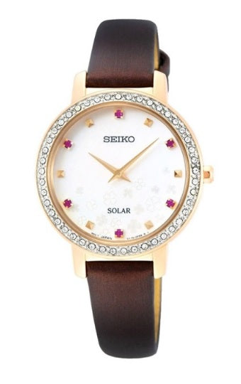 Caja de acero inoxidable en tono oro rosa con correa de piel color burdeos. Bisel fijo de acero inoxidable en tono oro rosa con cristales. Esfera de nácar con manecillas en tono oro rosa y marcadores de hora piramidales. Tipo de esfera: analógica. Movimiento Seiko Calibre V115 eco-drive. Cristal Hardlex resistente a los arañazos. Tirar/empujar la corona. Parte trasera sólida. Forma de caja redonda, tamaño de caja: 30,5 mm. Cierre de espiga. Resistente al agua a 50 metros / 165 pies.